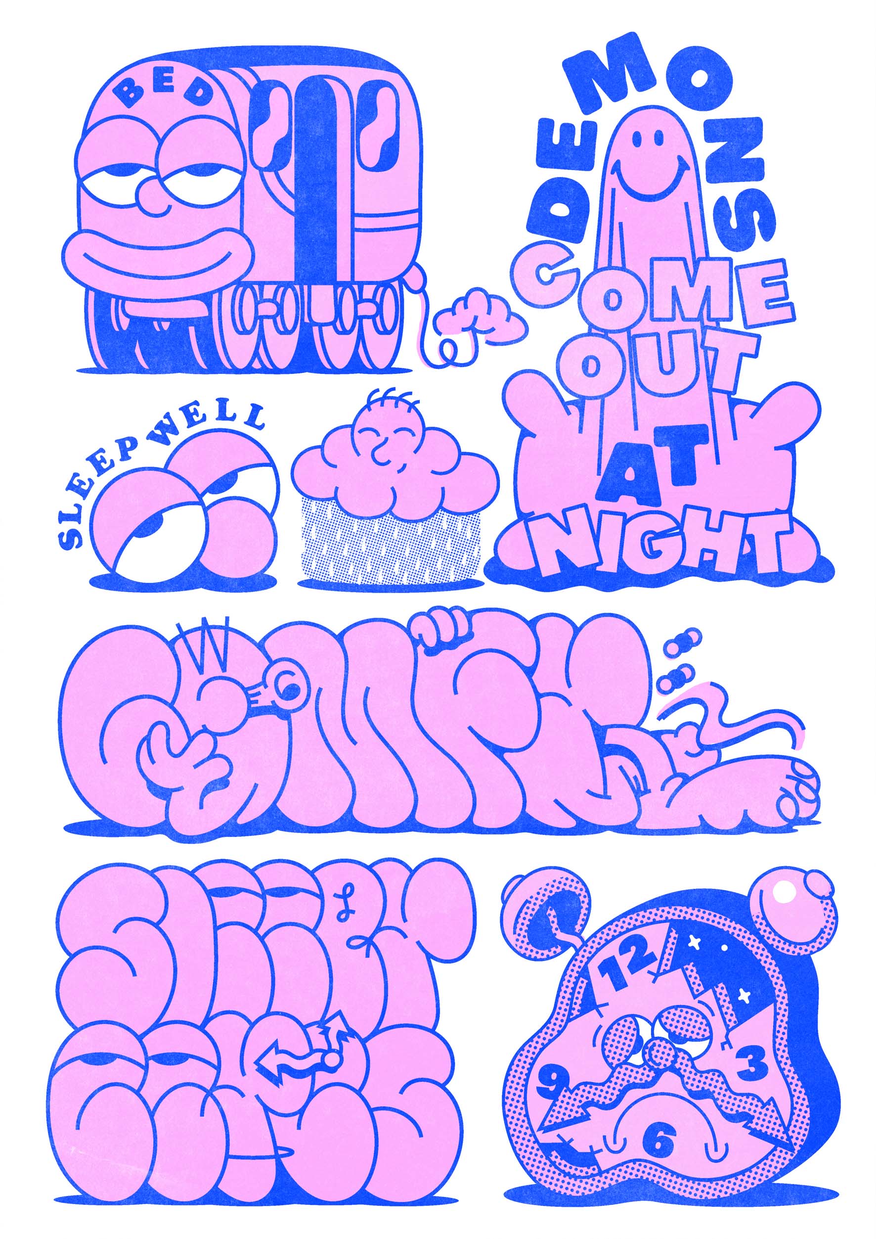 A series of 4 Illustrations all inspired by sleep. They were all risograph printed and sold in Hens Teeth.